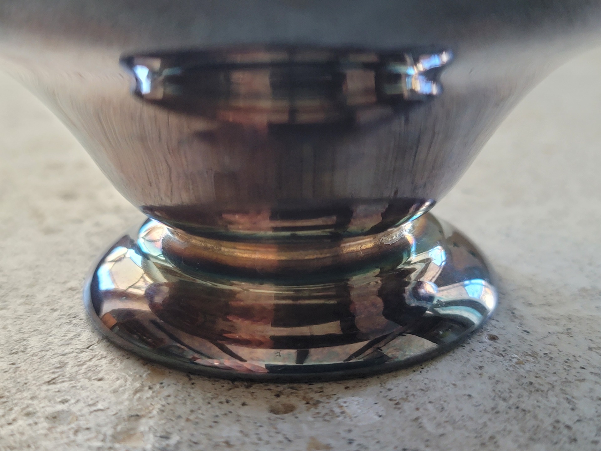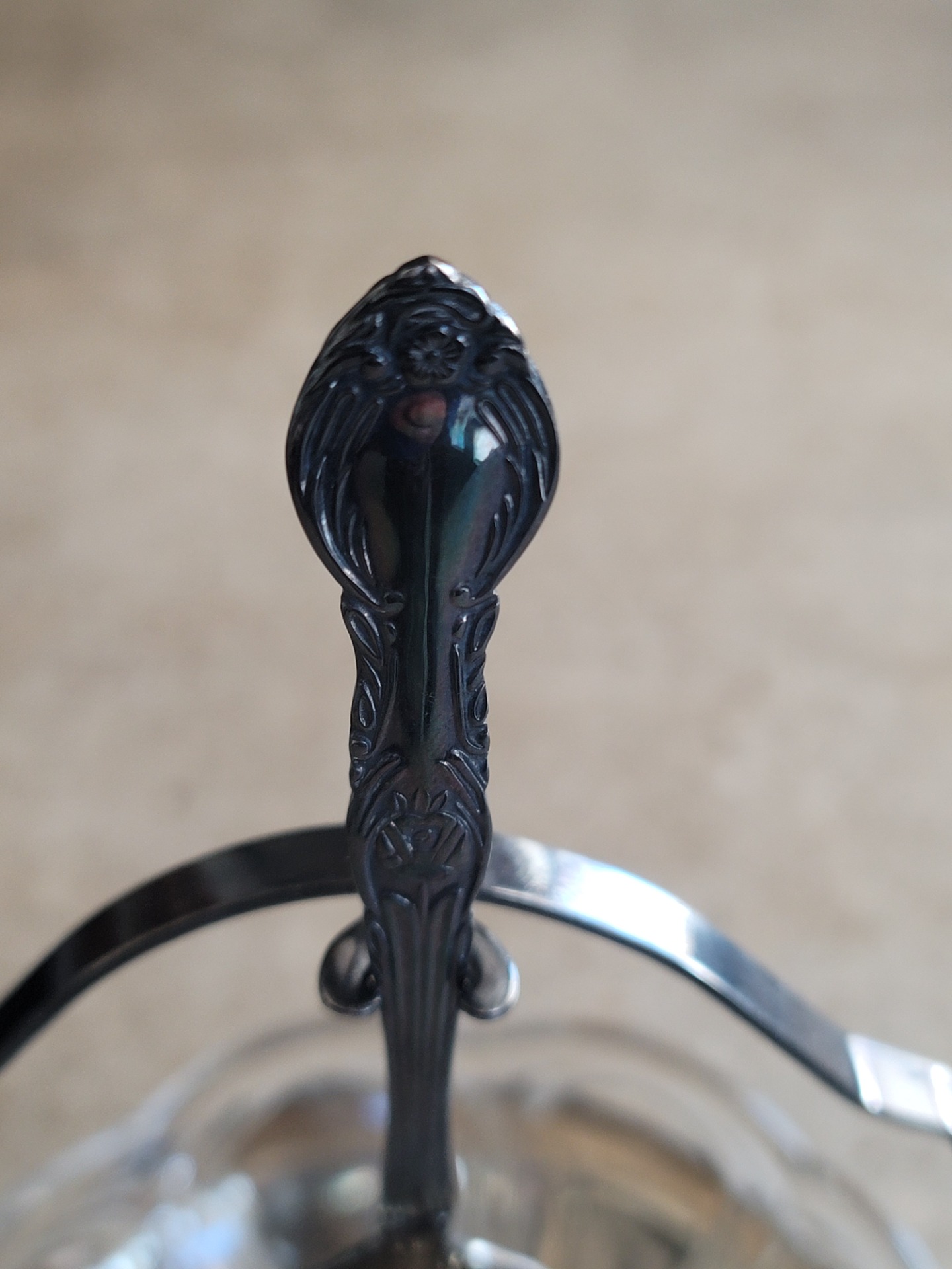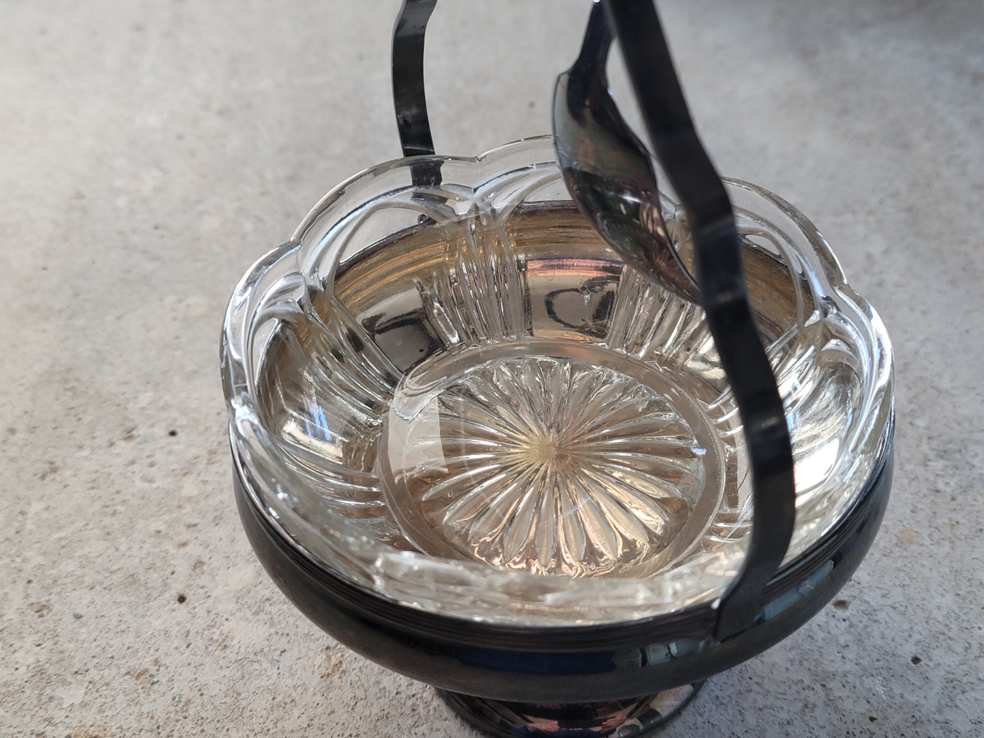 Elegantná vintage cukornička so sklenenou vložkou a kovovým stojanom zo zliatiny alpaky.