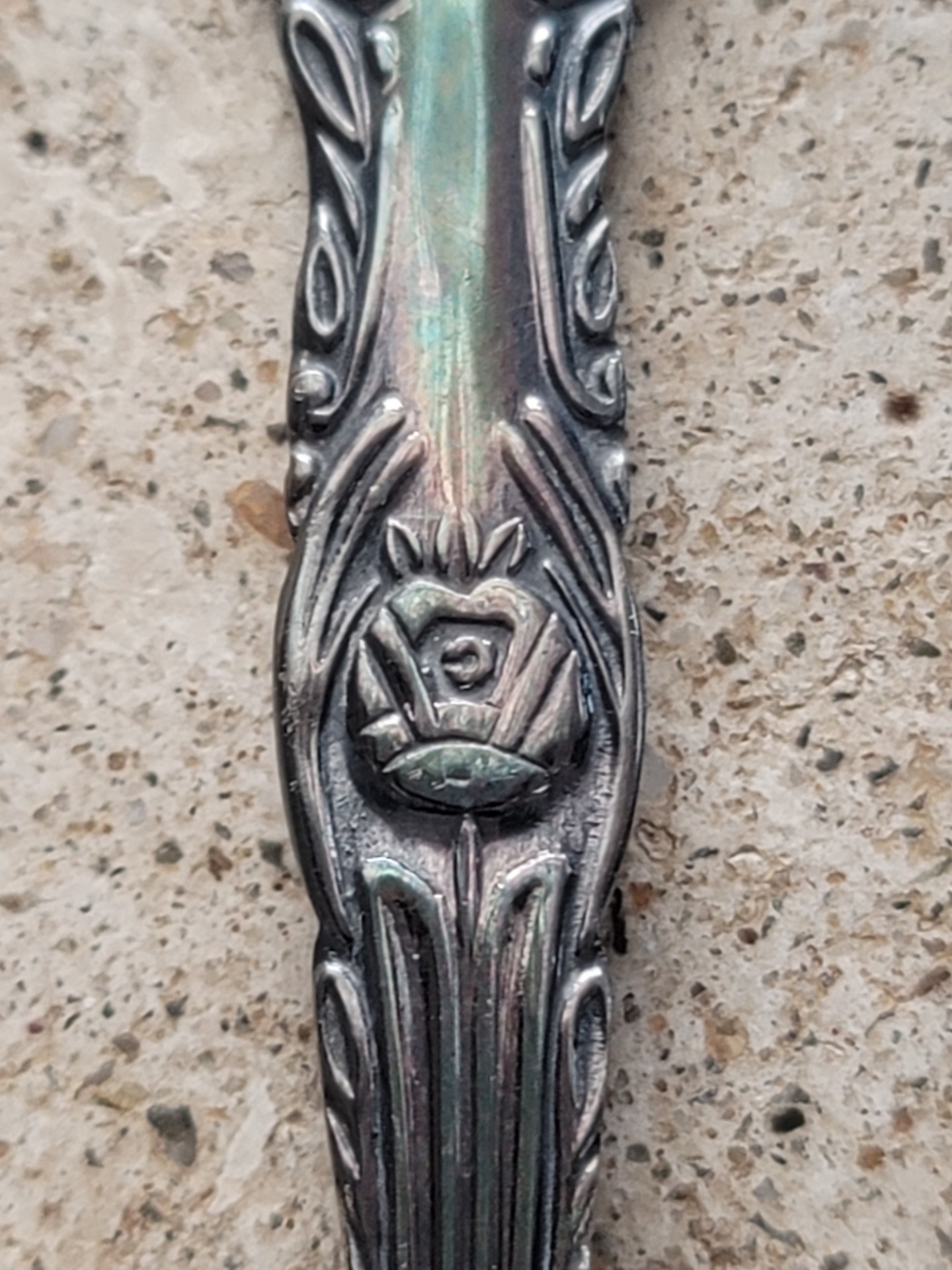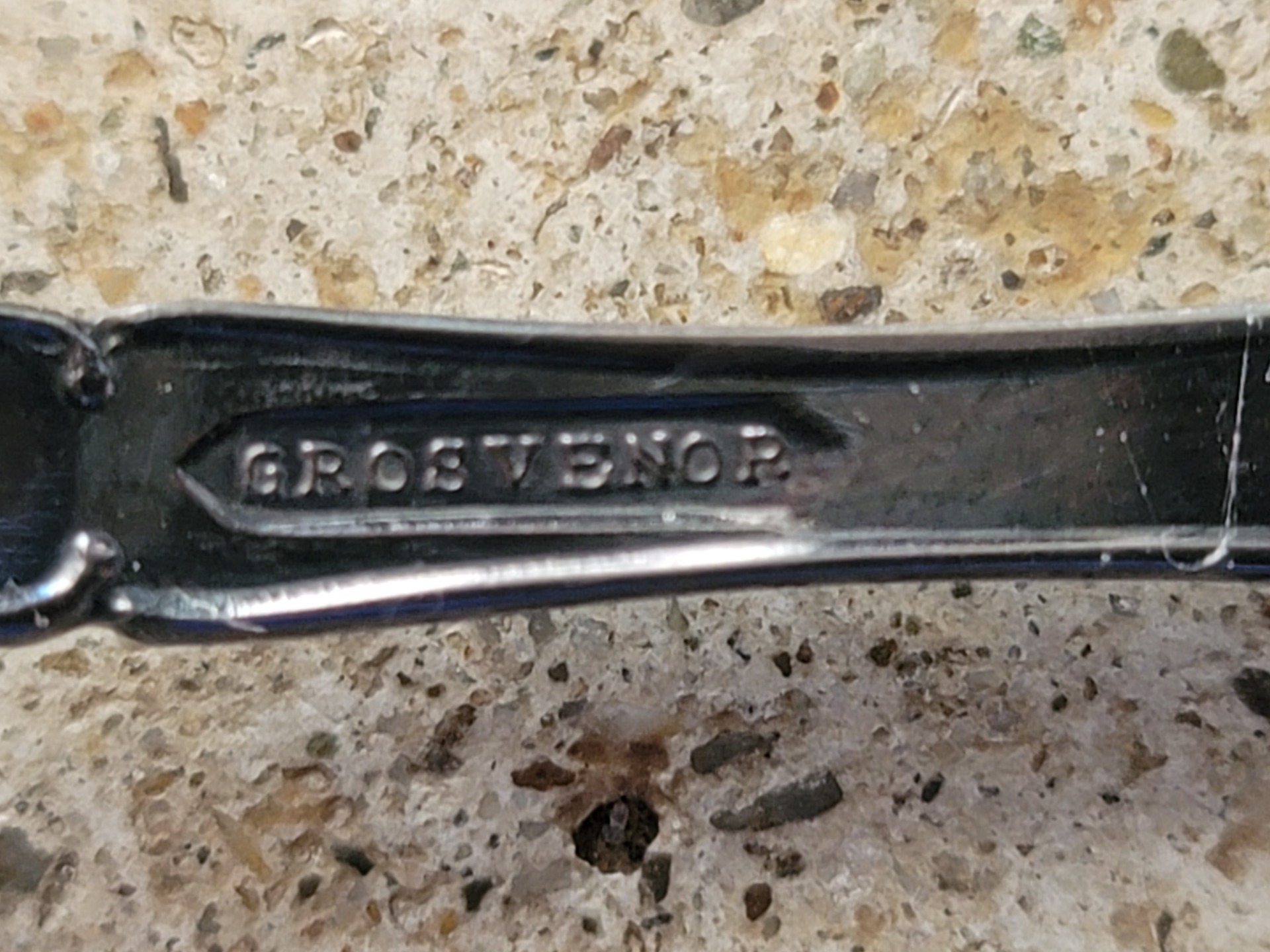 Lyžička s nápisom GROSVENOR pochádza z obdobia okolo 1930–40, vyrobená v Austrálii firmou Grosvenor Silver Plate Co., vzor s florálnym motívom ruže v secesno-deco štýle.