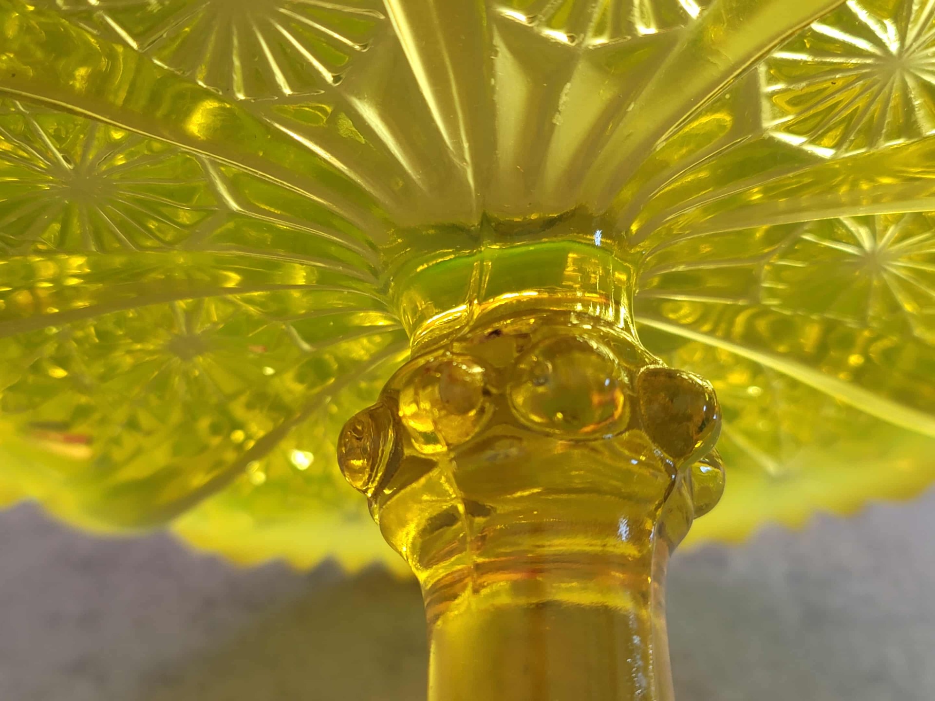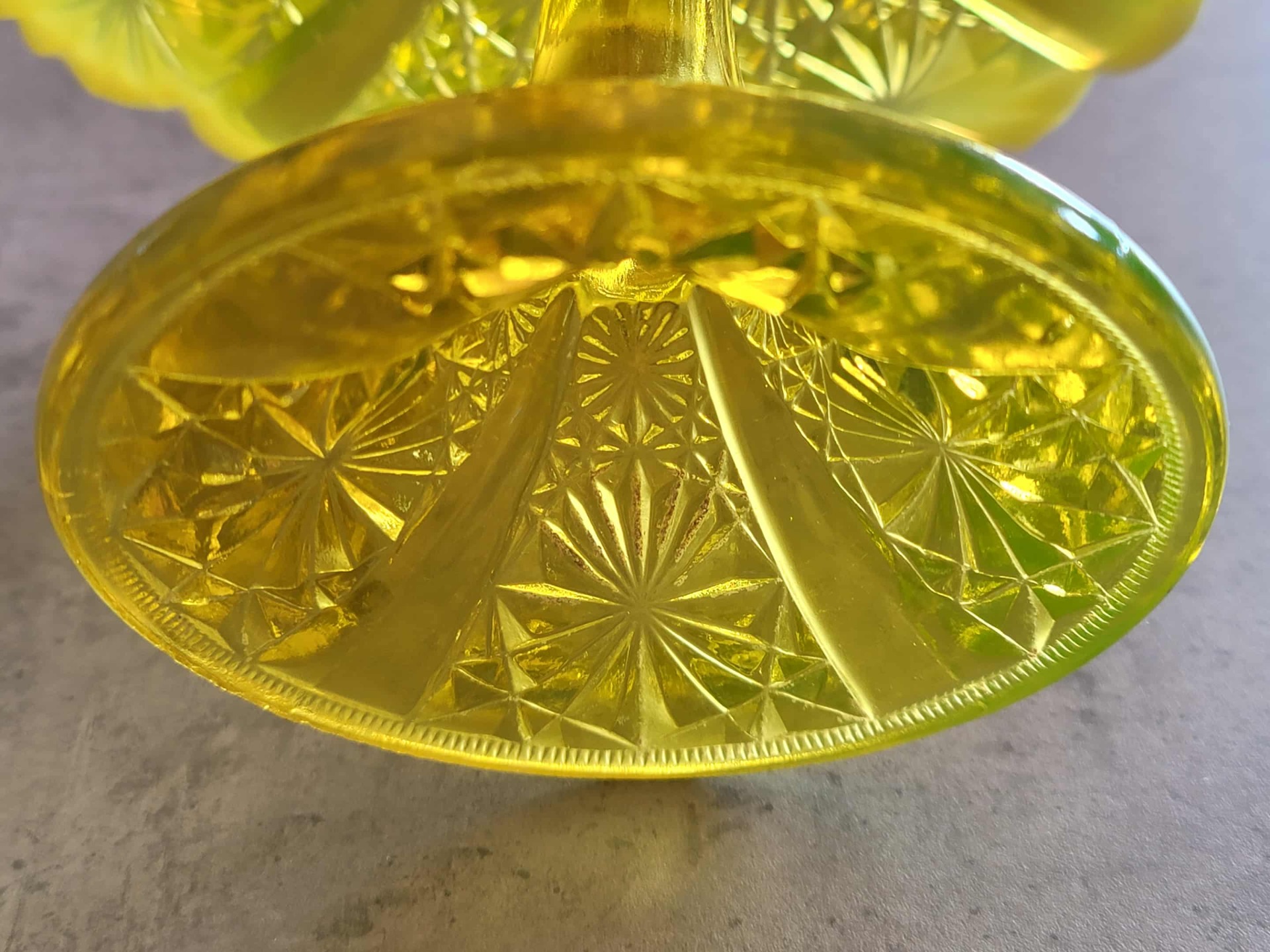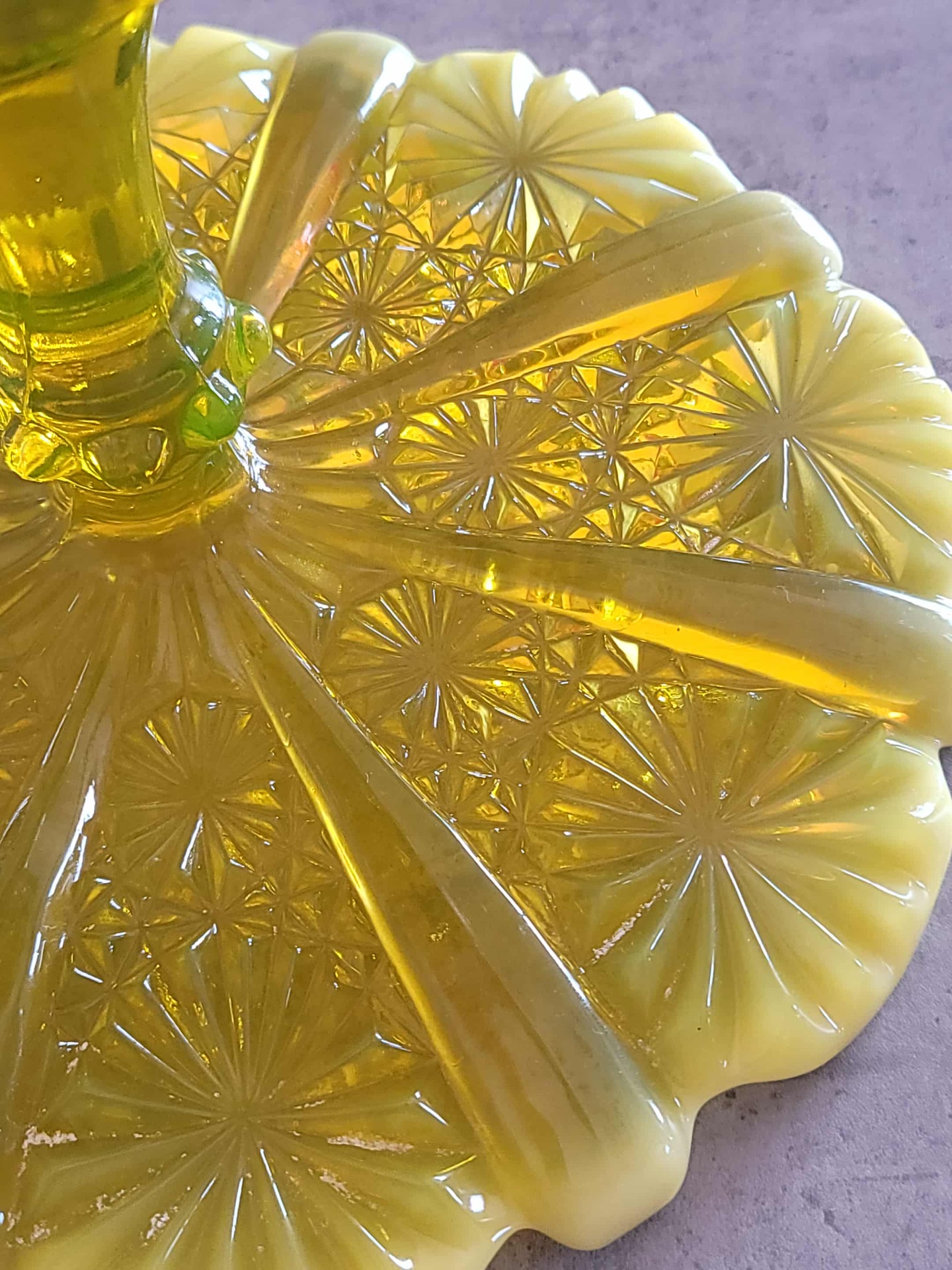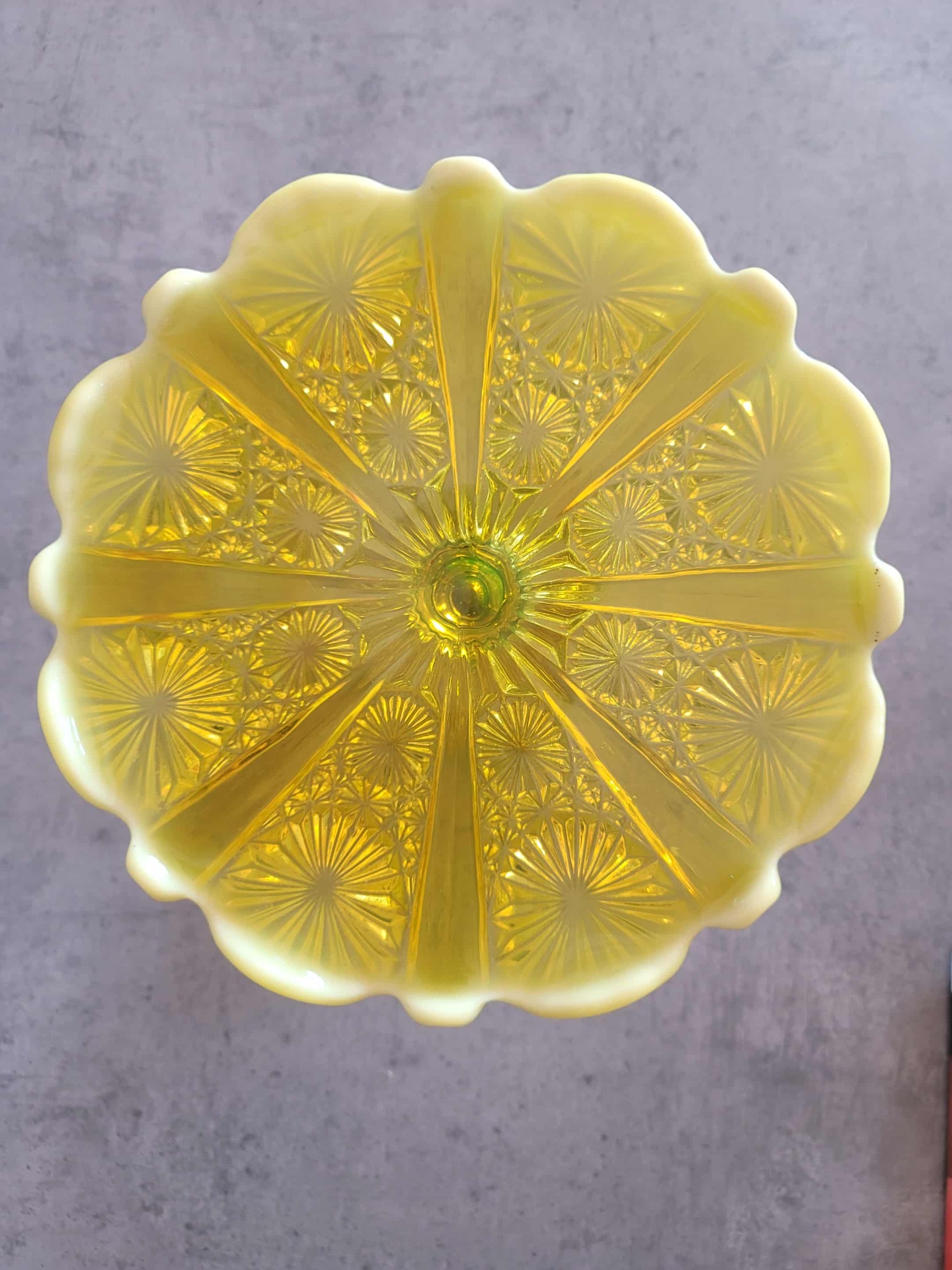 Elegantný historický stojan z lisovaného uránového skla v žiarivom odtieni primrose yellow, doplnený o jemný opalový mliečny okraj, typický pre britské sklo konca 19. storočia. Horná misa zaujme bohatým geometrickým zdobením ktorý imituje brúsené sklo, no zachováva si jemnosť lisovanej victoriánskej výroby. Siluetu dopĺňa výrazná zdobená stonka s prstencom sklenených guliek, vyrobená v niekoľkodielnej forme.