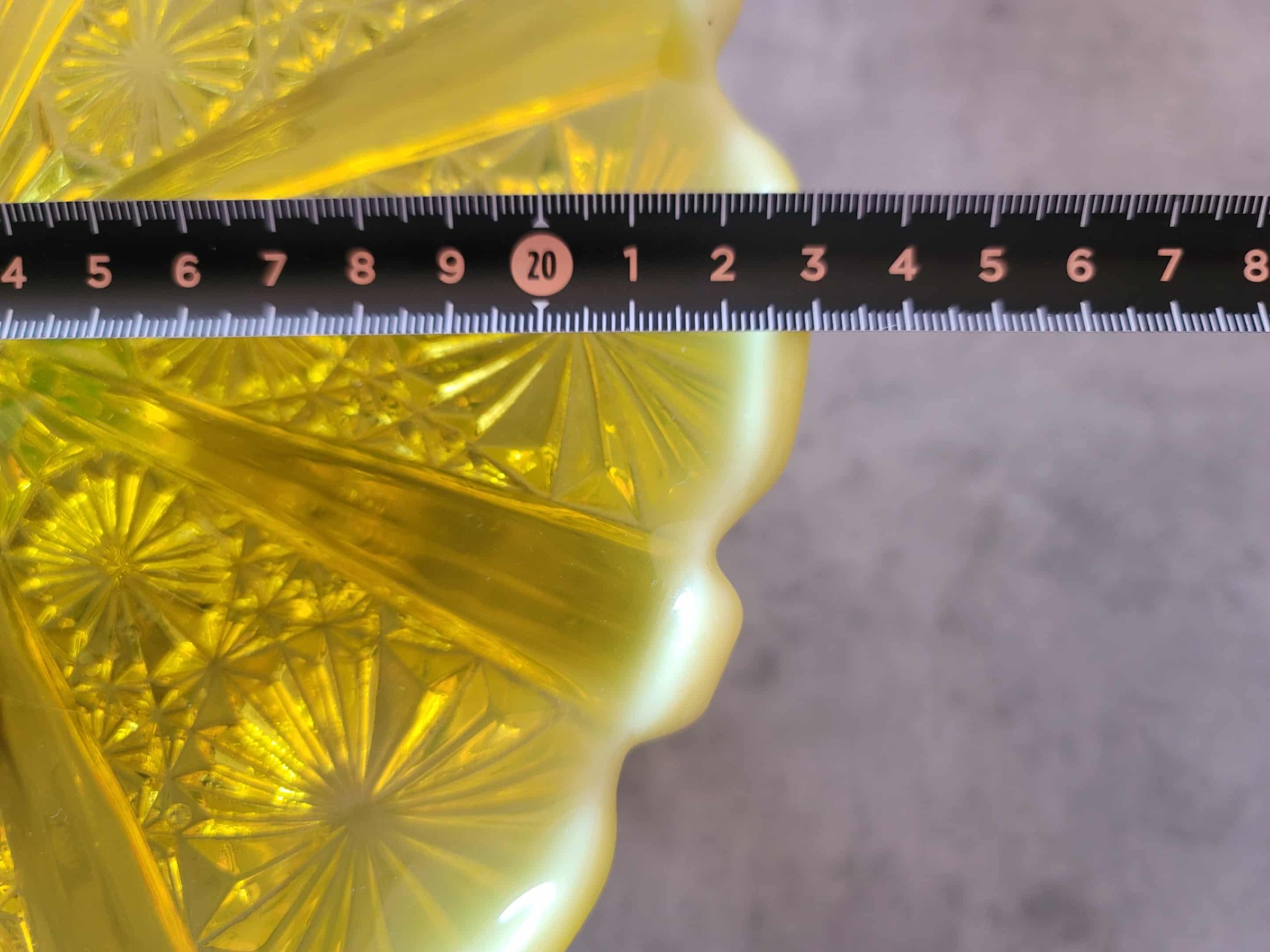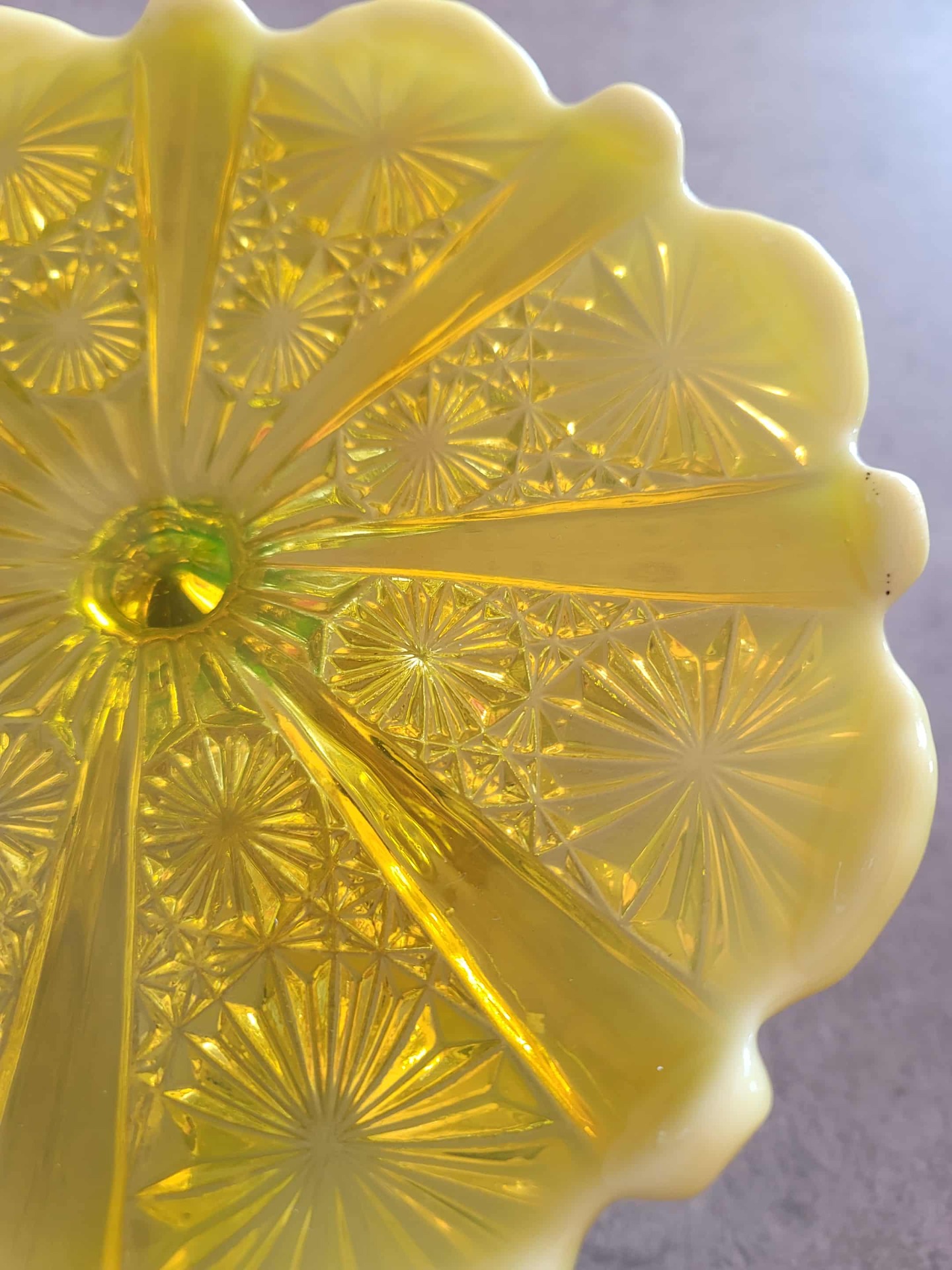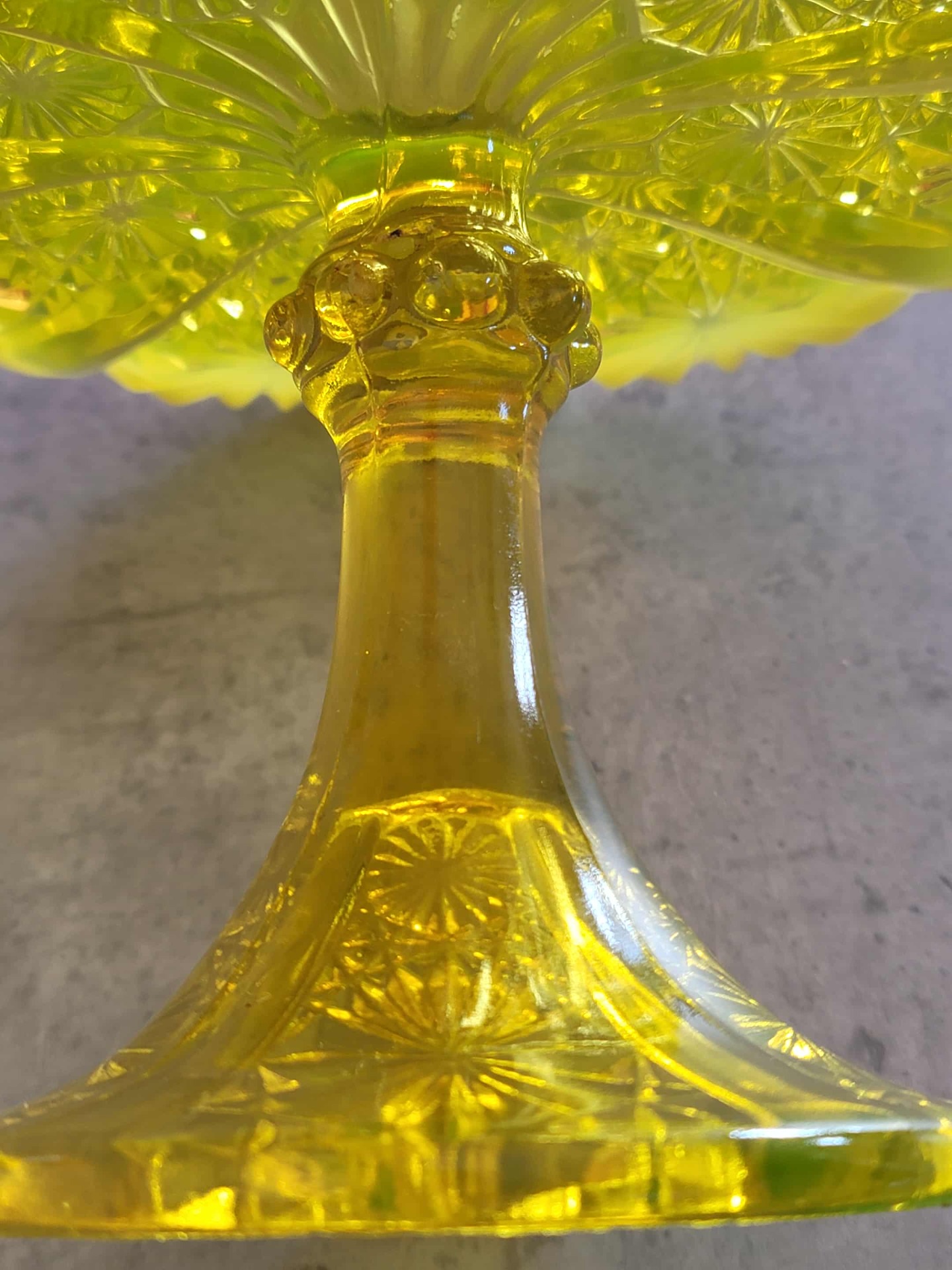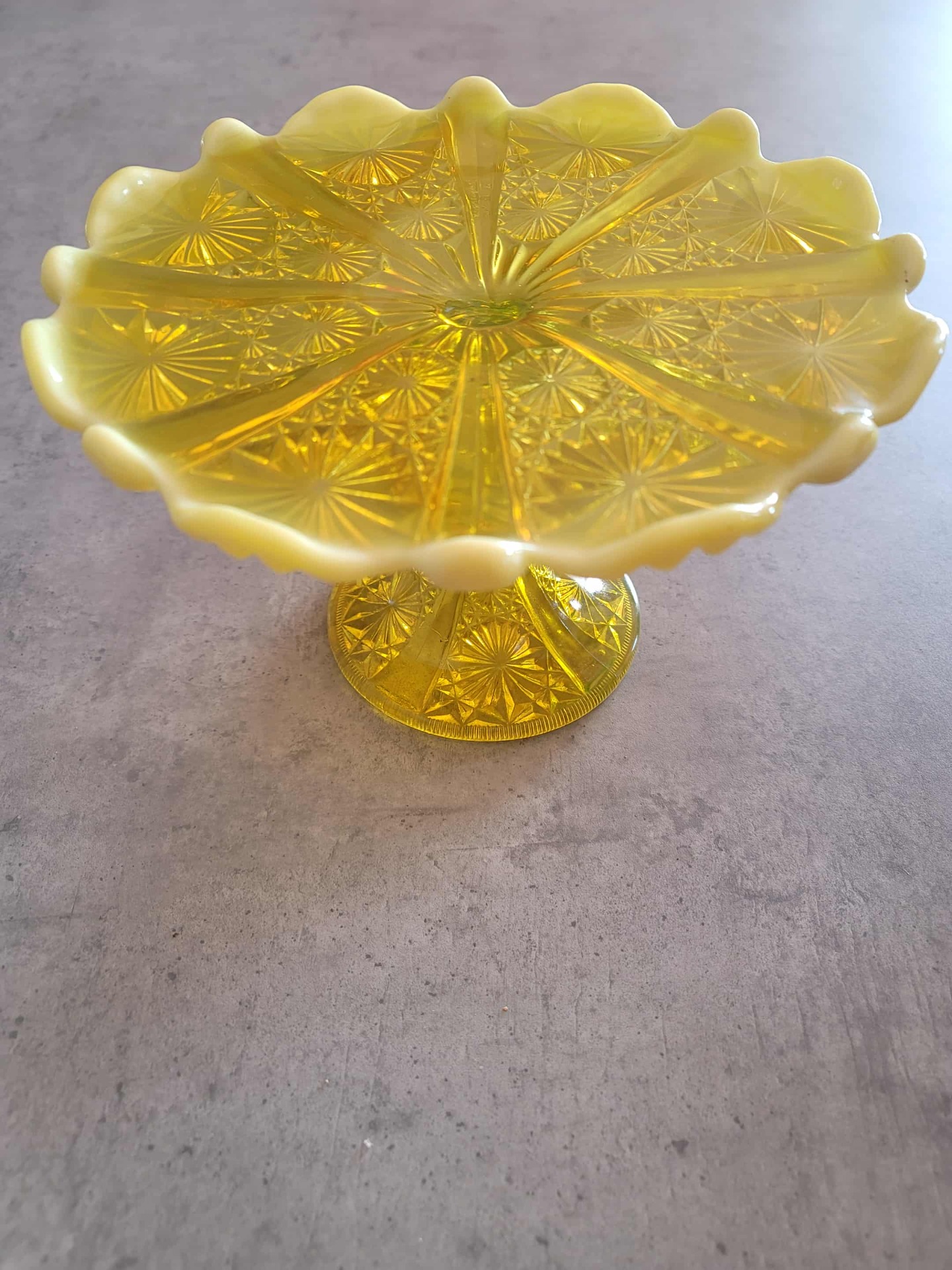 Elegantný historický stojan z lisovaného uránového skla v žiarivom odtieni primrose yellow, doplnený o jemný opalový mliečny okraj, typický pre britské sklo konca 19. storočia. Horná misa zaujme bohatým geometrickým zdobením ktorý imituje brúsené sklo, no zachováva si jemnosť lisovanej victoriánskej výroby. Siluetu dopĺňa výrazná zdobená stonka s prstencom sklenených guliek, vyrobená v niekoľkodielnej forme.