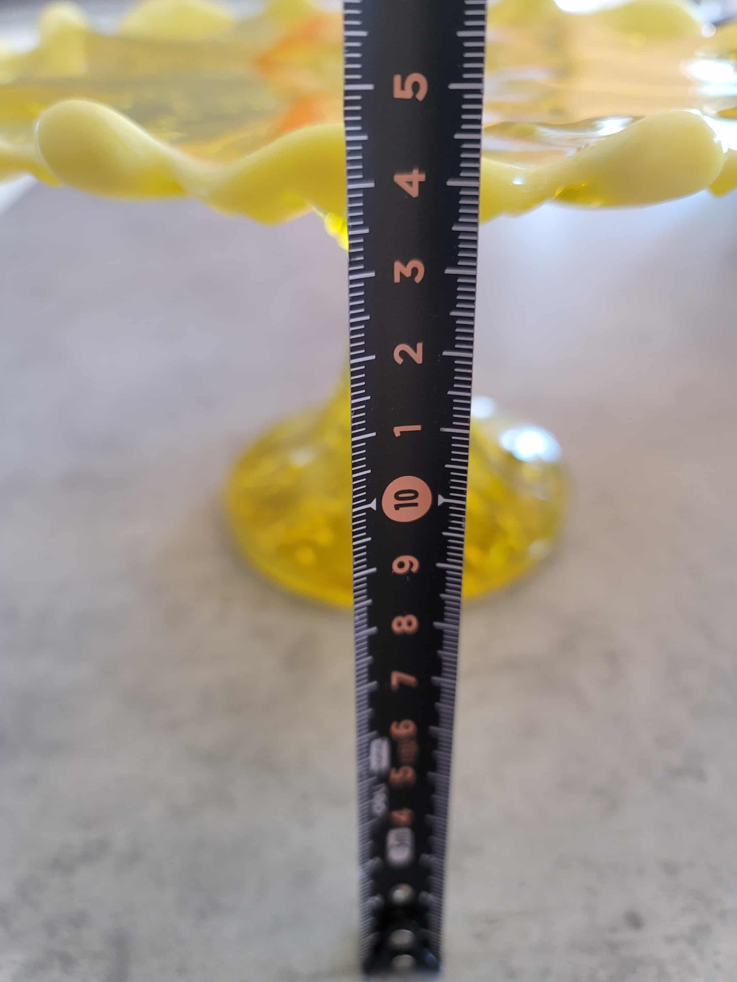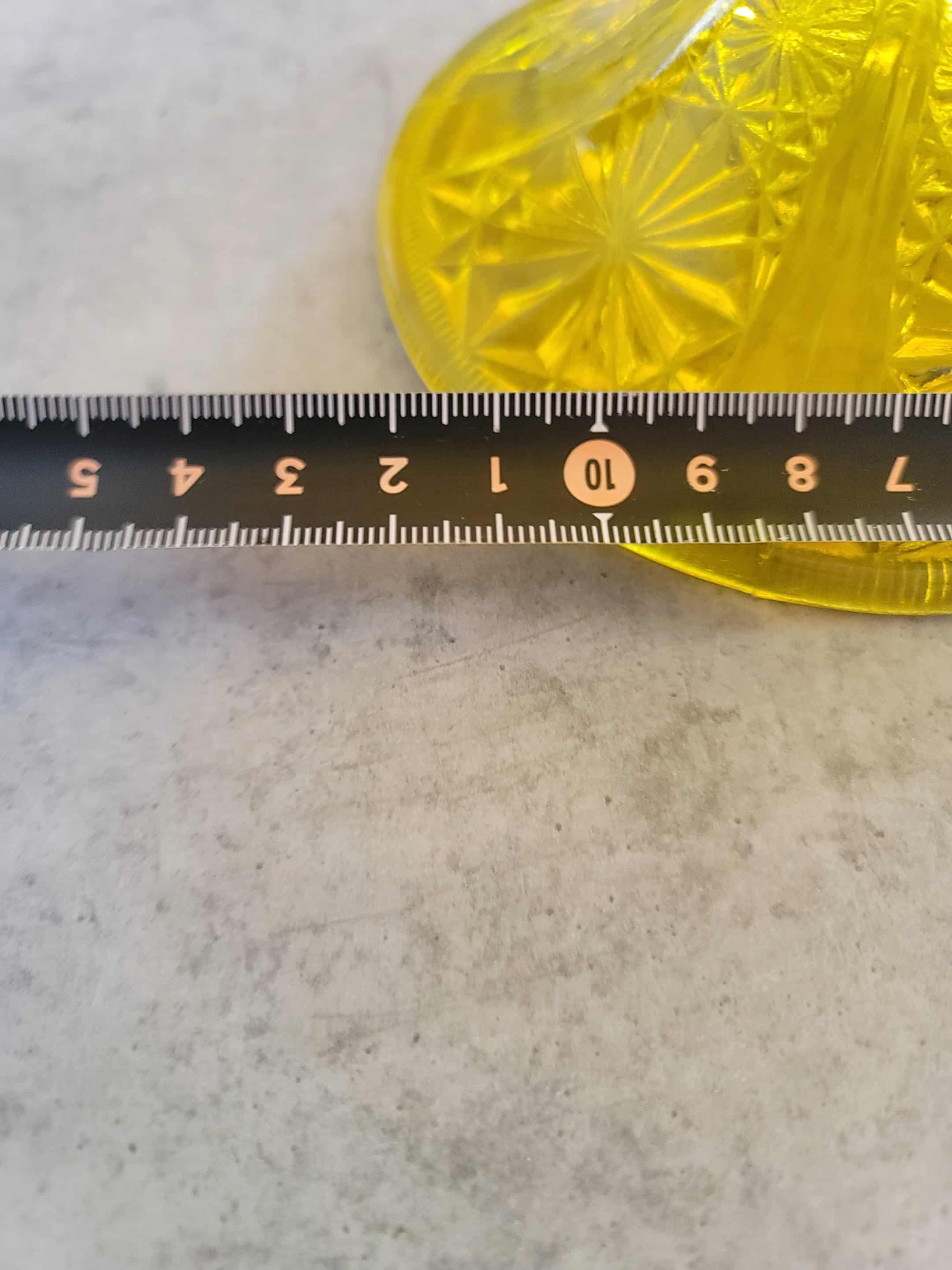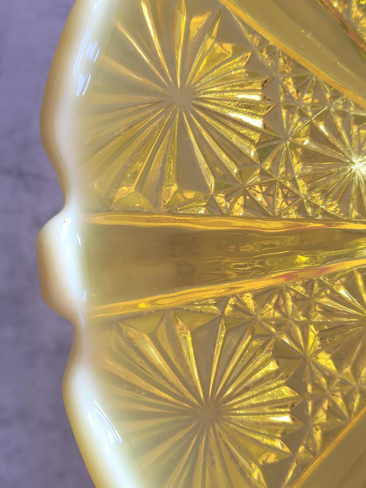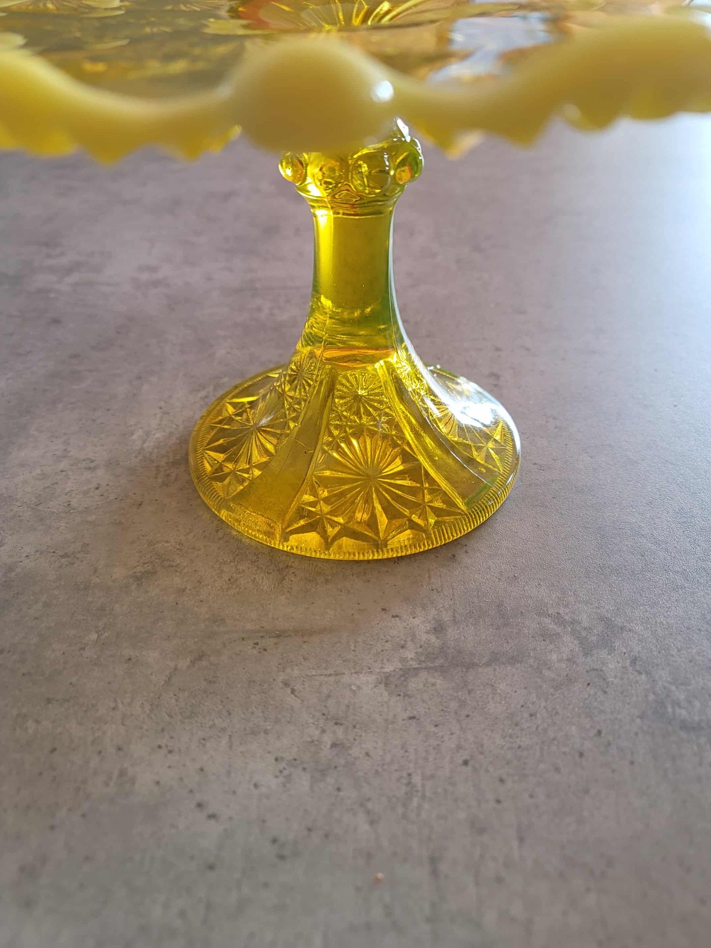 Elegantný historický stojan z lisovaného uránového skla v žiarivom odtieni primrose yellow, doplnený o jemný opalový mliečny okraj, typický pre britské sklo konca 19. storočia. Horná misa zaujme bohatým geometrickým zdobením ktorý imituje brúsené sklo, no zachováva si jemnosť lisovanej victoriánskej výroby. Siluetu dopĺňa výrazná zdobená stonka s prstencom sklenených guliek, vyrobená v niekoľkodielnej forme.