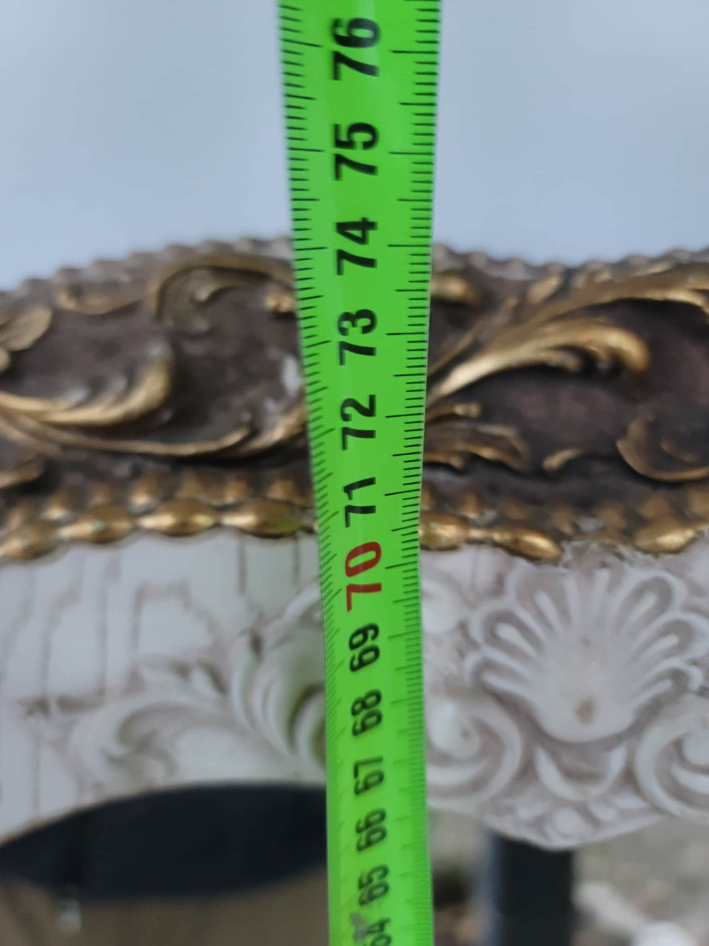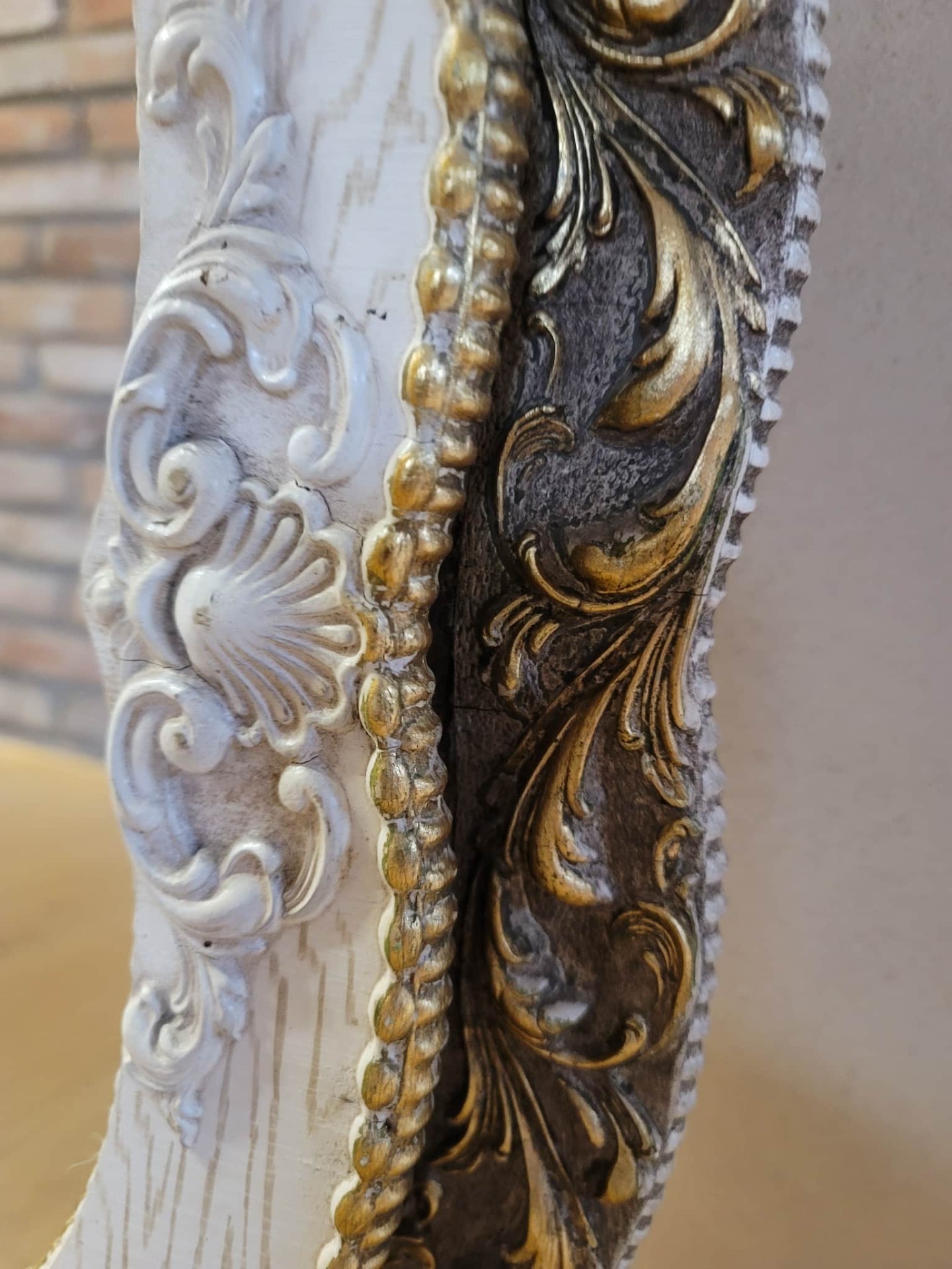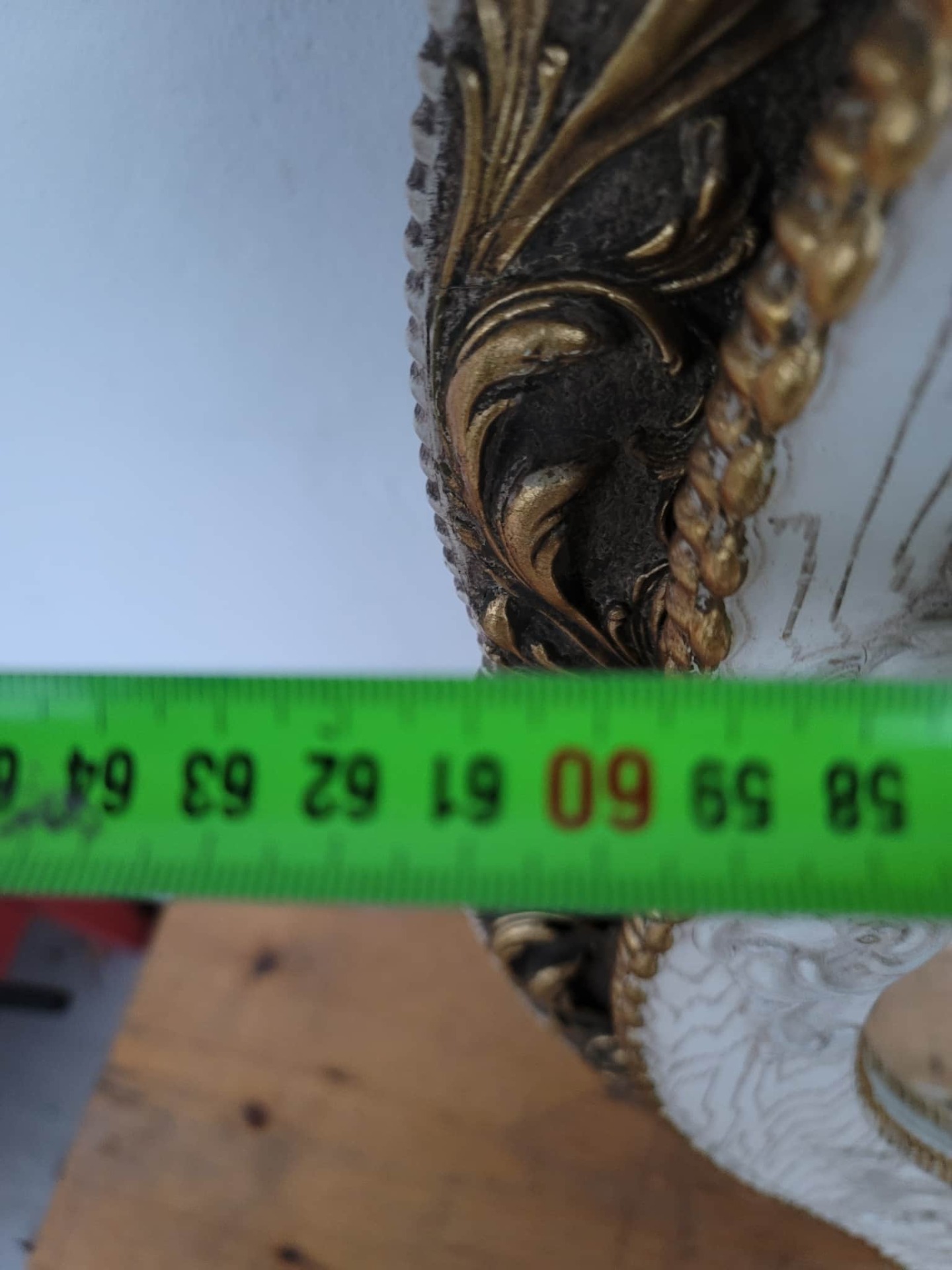 Ponúkame krásne veľké okrúhle vintage zrkadlo zo 60.–70. rokov v štýle Florentiner Rococo Revival. Rám je vyrobený zo sadrového odliatku a zdobený bohatou rokokovou ornamentikou – mušle, volutky, rastlinné motívy.