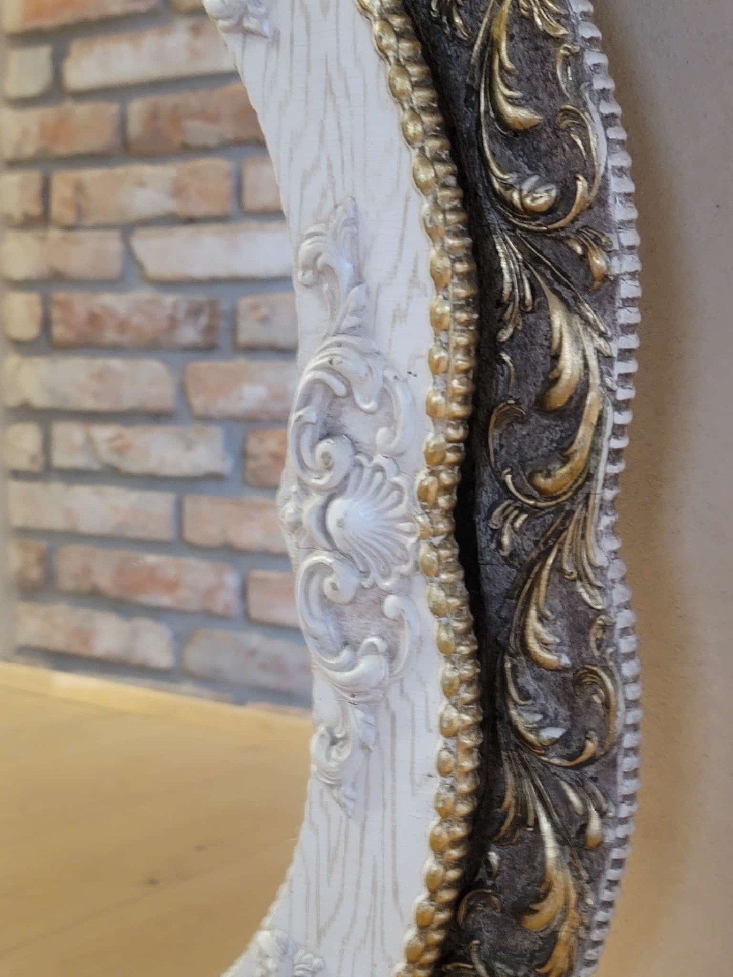 Povrch je ručne patinovaný v kombinácii antik bielej, zlata a tmavej lazúry, čo zrkadlu dodáva elegantný historický vzhľad.