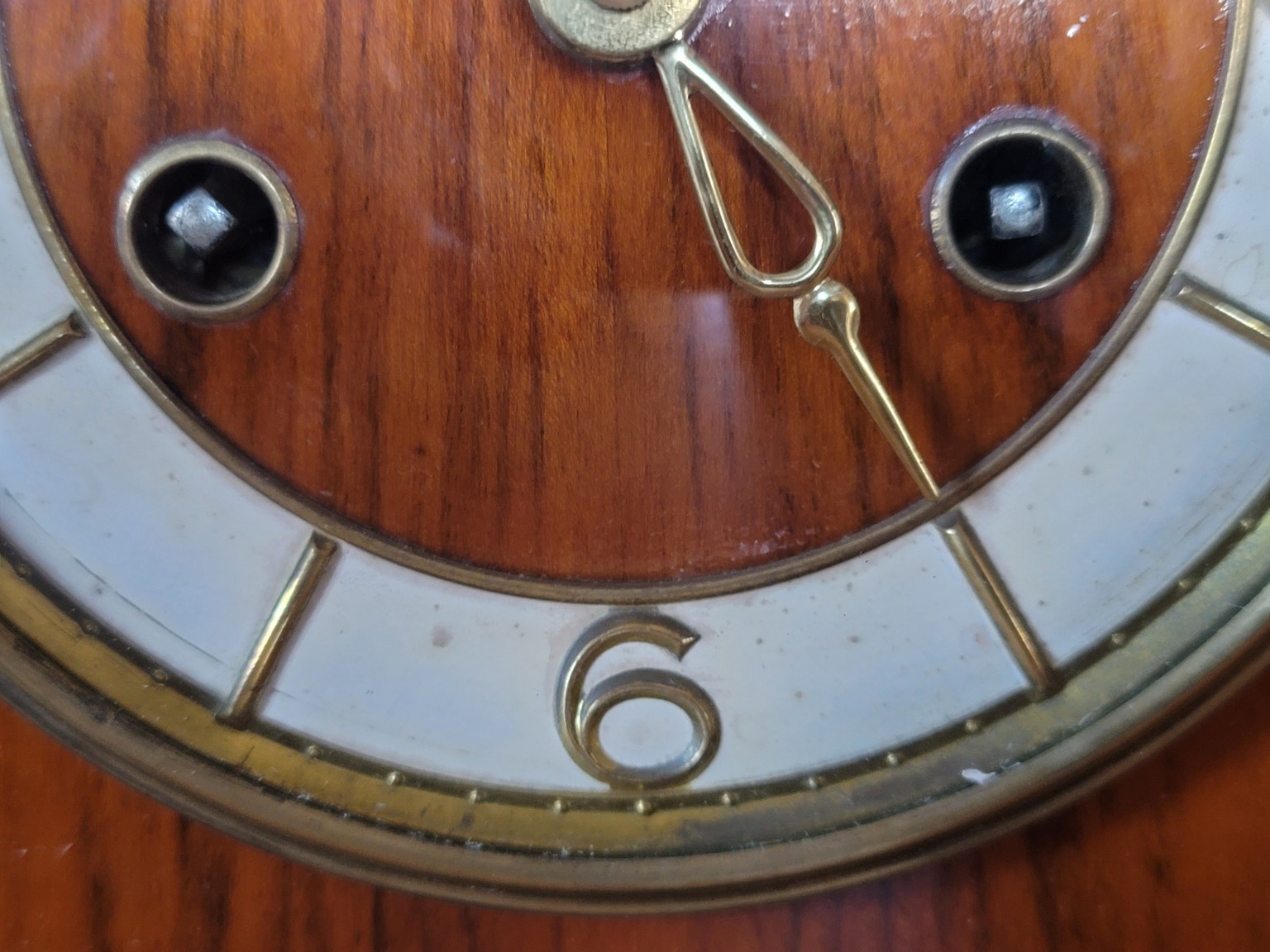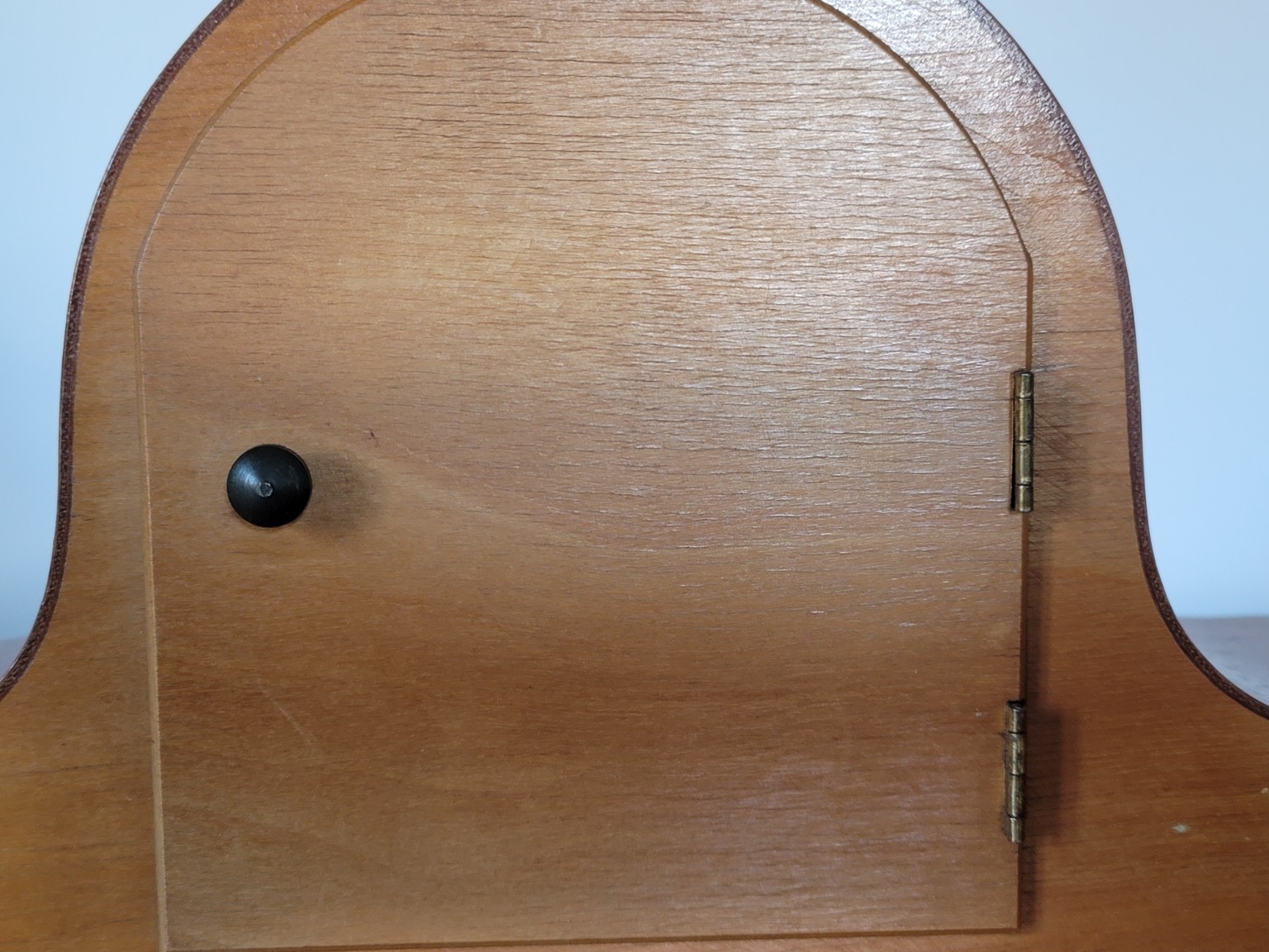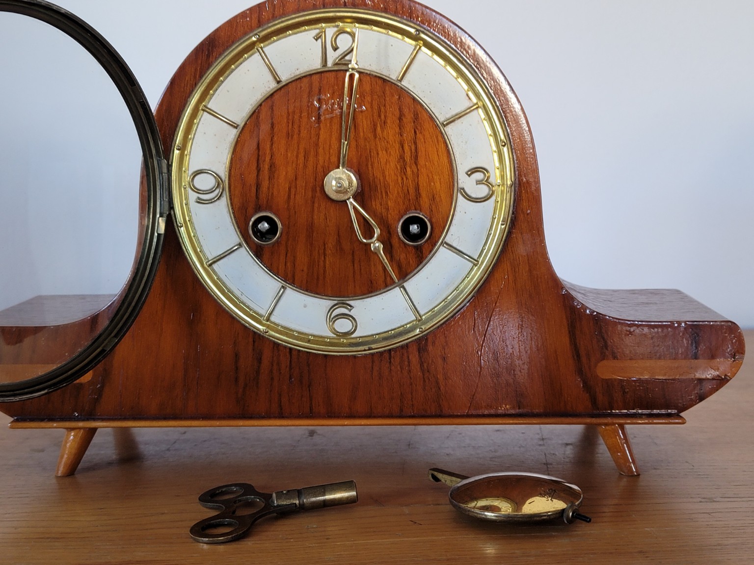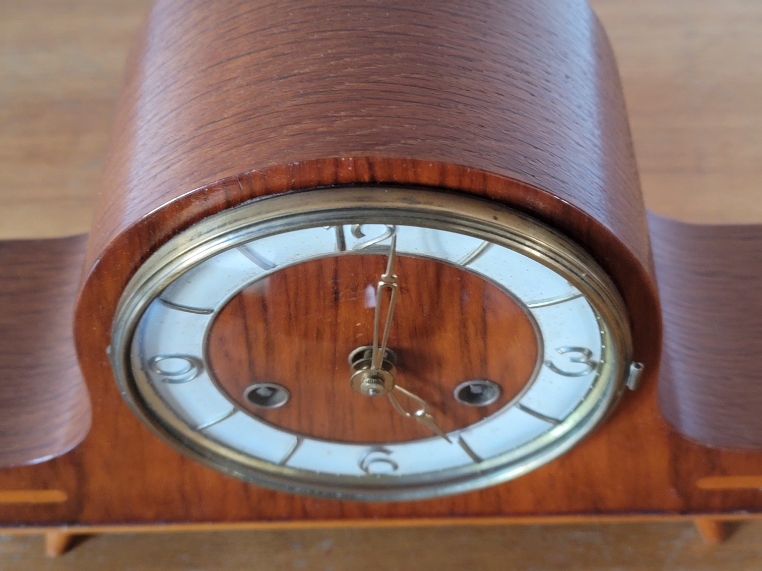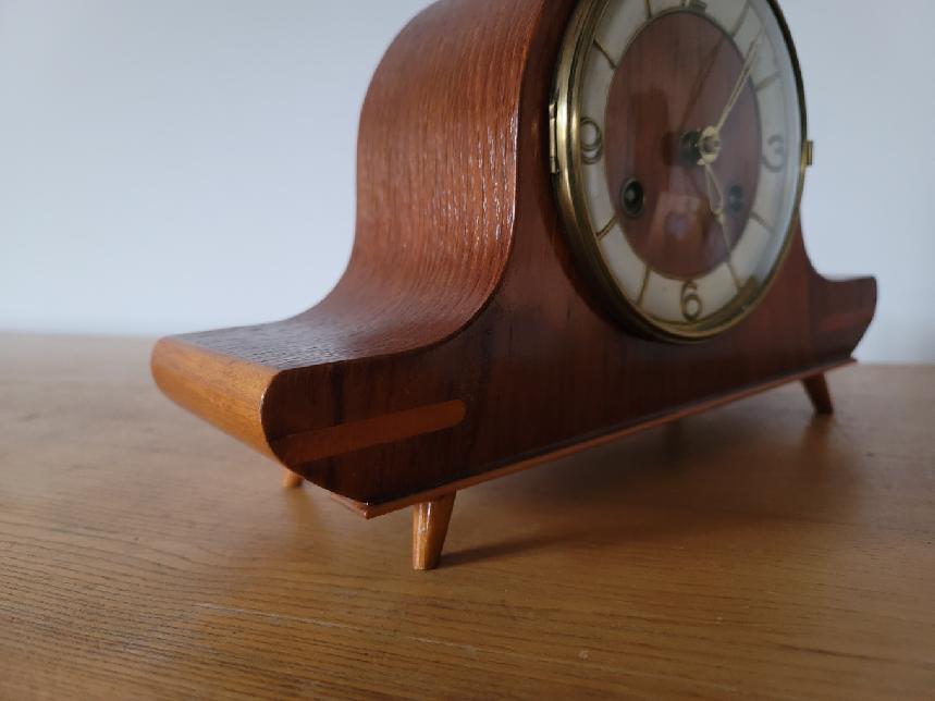 Puzdro je zhotovené z dreva s krásnou kresbou dyhy a jemnou bočnou intarziou. Typický oblý "streamline" tvar a subtílne nožičky dodávajú hodinám nadčasový charakter, ktorý sa výborne hodí do vintage aj moderných interiérov.