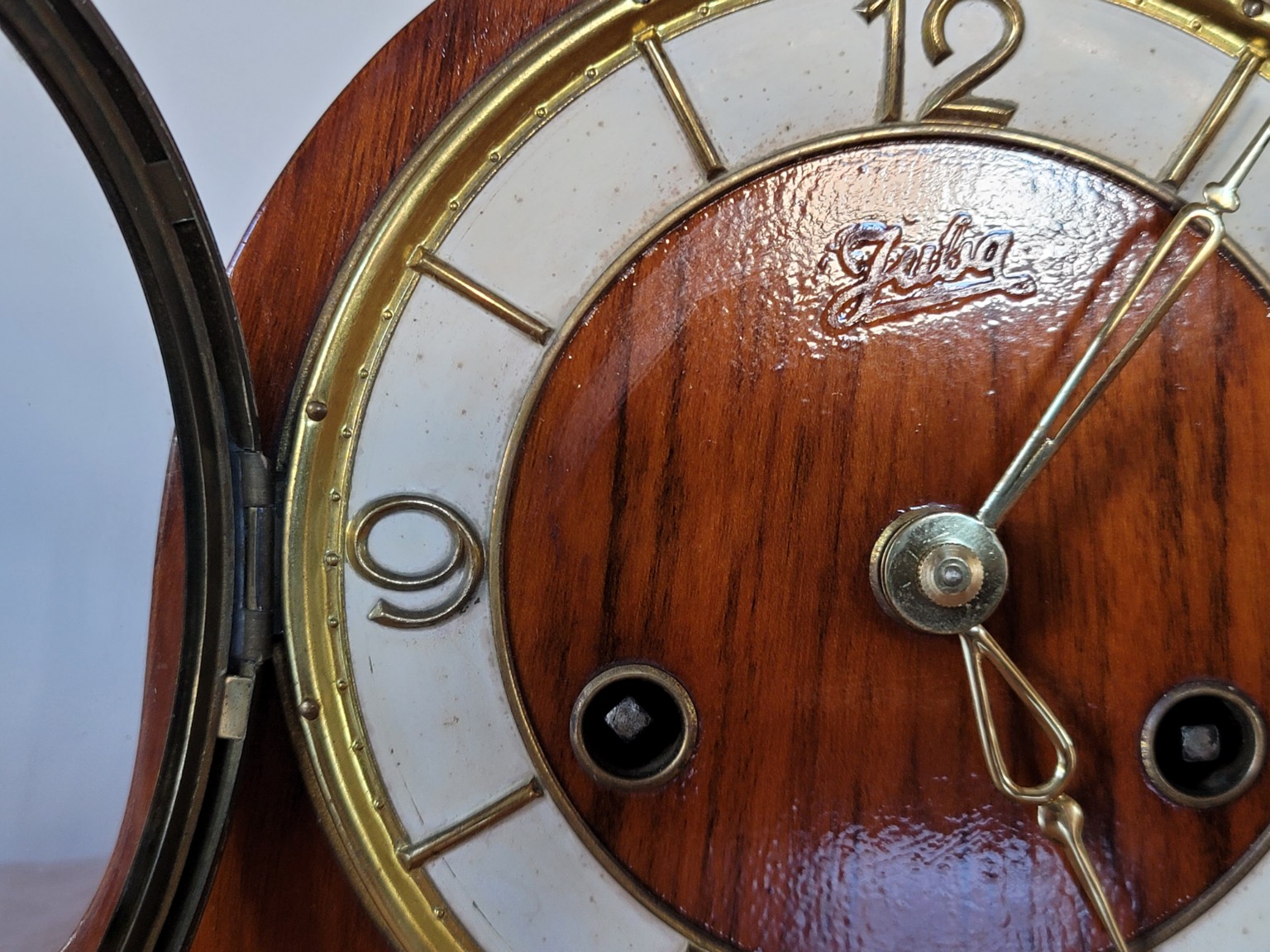 Elegantné mechanické stolové hodiny v štýle Art Deco, vyrobené v Nemecku približne v období 30.–40. rokov 20. storočia. Hodiny nesú obchodnú značku JUBA na ciferníku a sú osadené kvalitným nemeckým strojčekom Schlenker (Schwenningen, Württemberg).