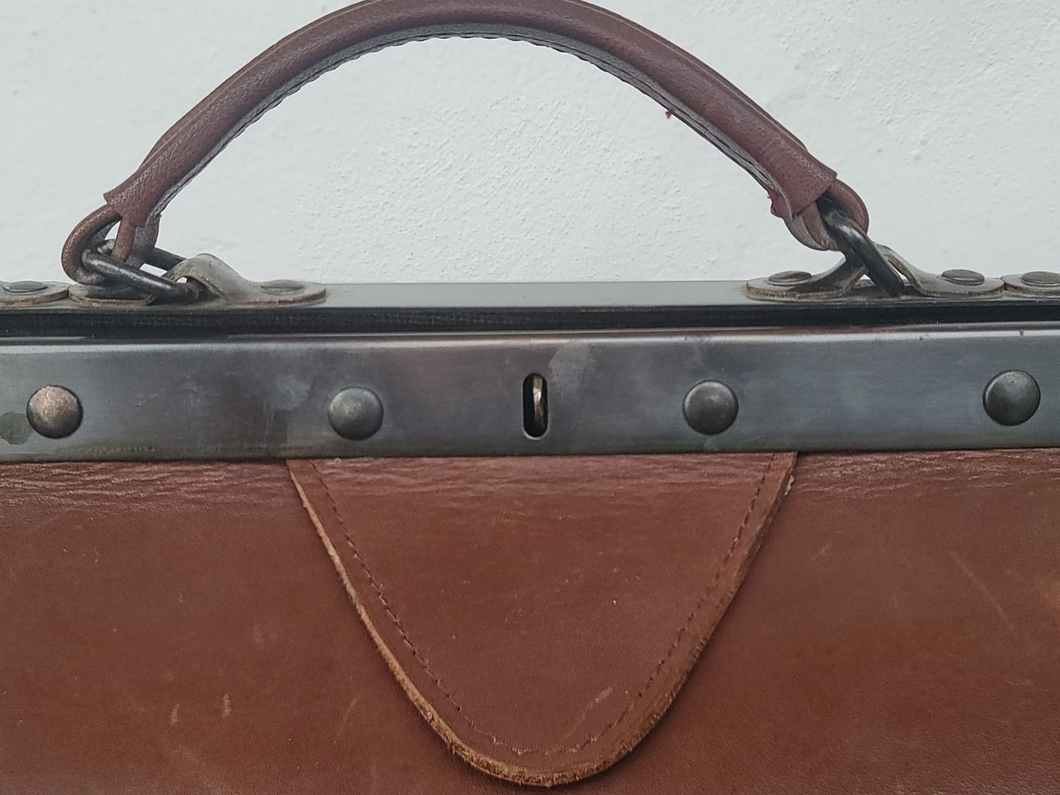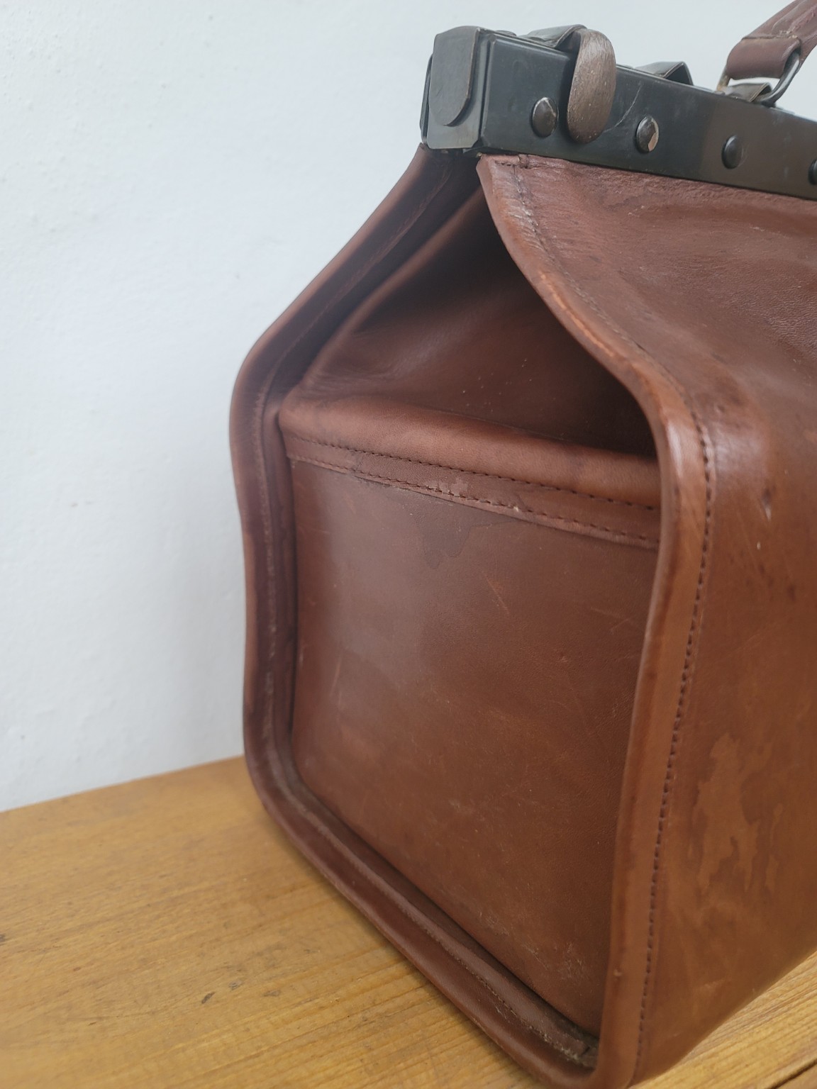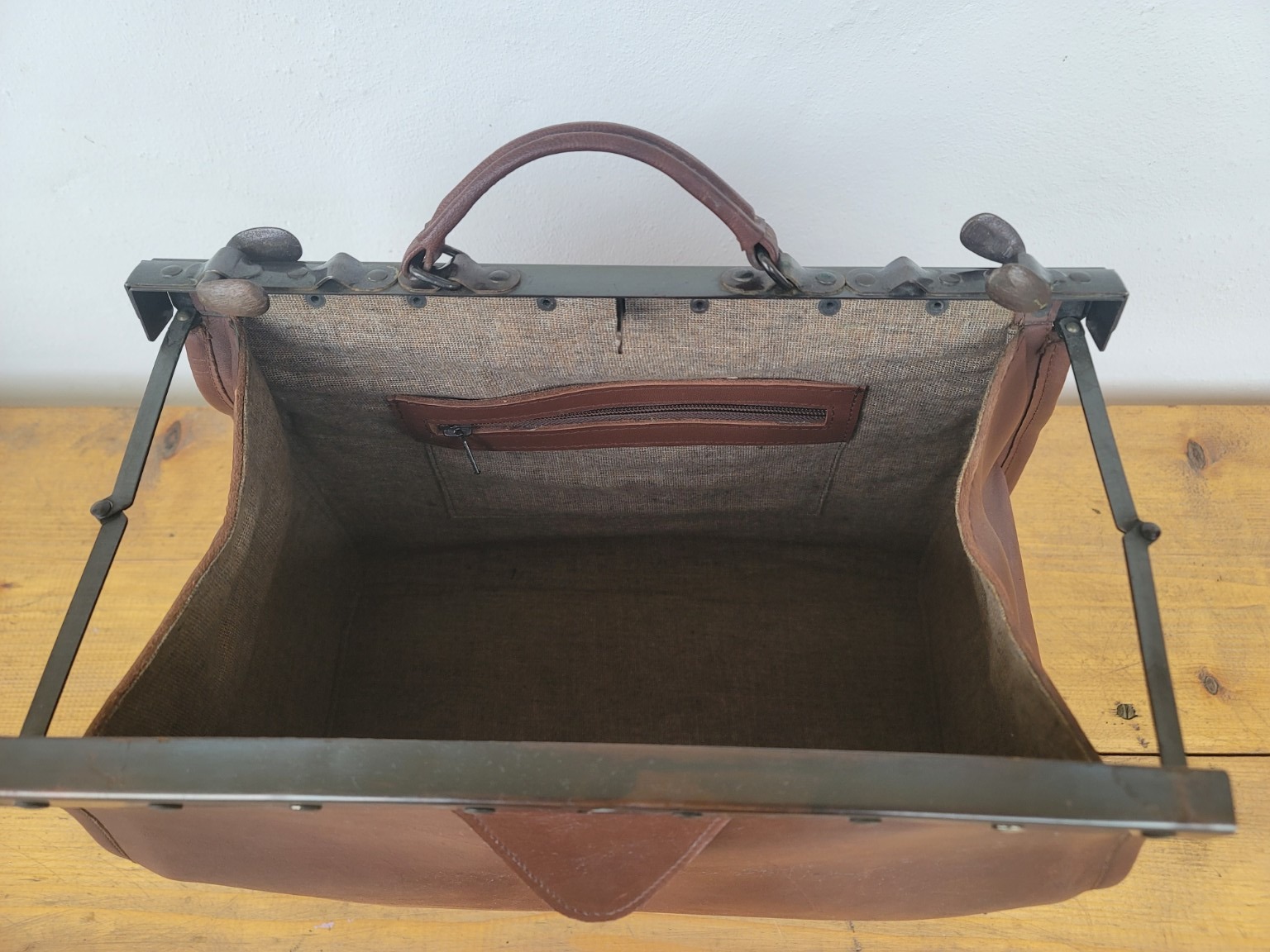 Originálna kožená doktorská taška z polovice 20. storočia s pevnou oceľovou rámovou konštrukciou a krásnou prirodzenou patinou.